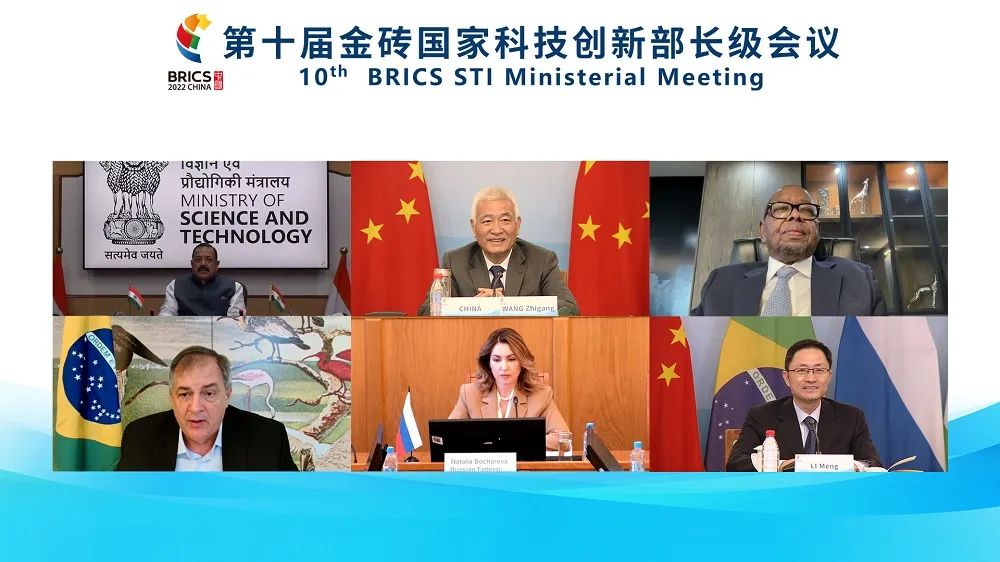 2022年9月27日,第十届金砖国家科技创新部长级会议在中国北京以线上方式成功举行。中国科技部部长王志刚、南非高等教育与科学创新部部长布莱德·恩齐曼迪、巴西科技创新部部长保罗·阿尔维姆、俄罗斯科学与高等教育部副部长娜塔莉·鲍切诺娃、印度科技与地球科学部部长吉坦德拉·辛格出席了本次会议,会议由中国科技部副部长李